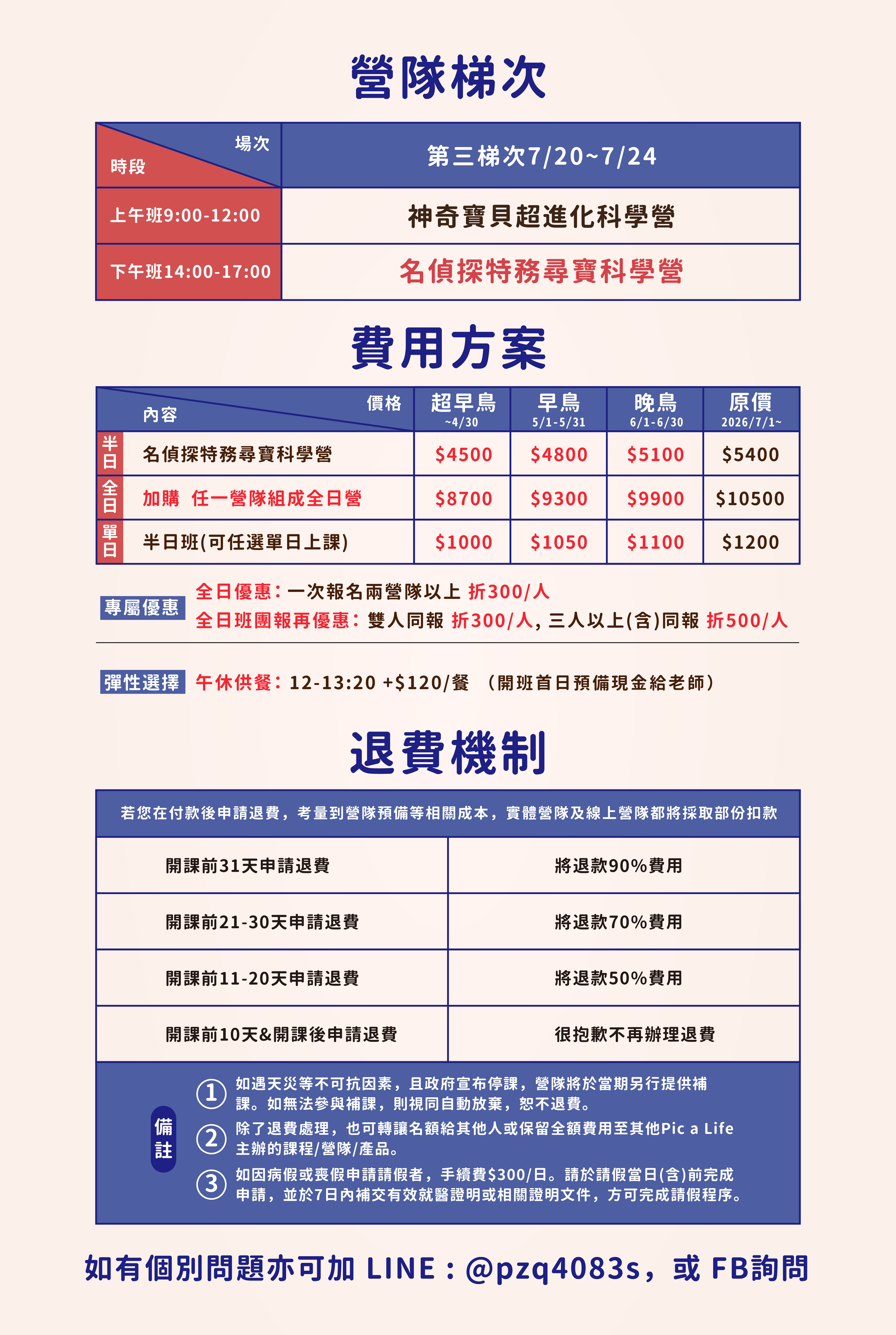 ➍ 由於營隊有最低開班人數6位,我們將於 12 月 20 日 左右 公布最終開班梯次與營隊,並自 12 月初與報名人數較少的營隊家長聯繫,協助調整校區、營隊或梯次。若報名營隊未開班,可透過 LINE 客服調整至其他梯次/營隊/校區,或選擇全額退款。