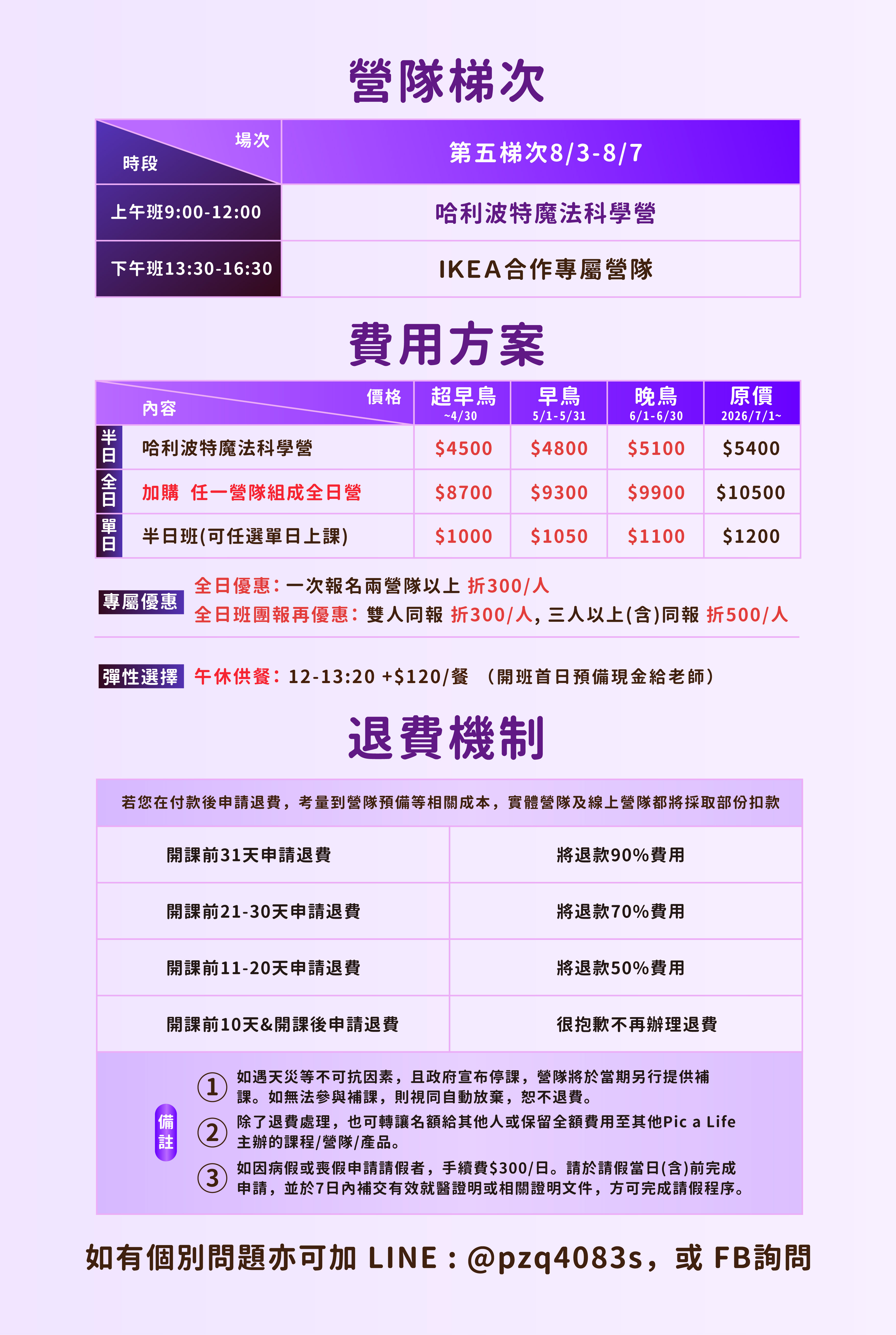 ➍ 由於營隊有最低開班人數6位,我們將於 12 月 20 日 左右 公布最終開班梯次與營隊,並自 12 月初與報名人數較少的營隊家長聯繫,協助調整校區、營隊或梯次。若報名營隊未開班,可透過 LINE 客服調整至其他梯次/營隊/校區,或選擇全額退款。