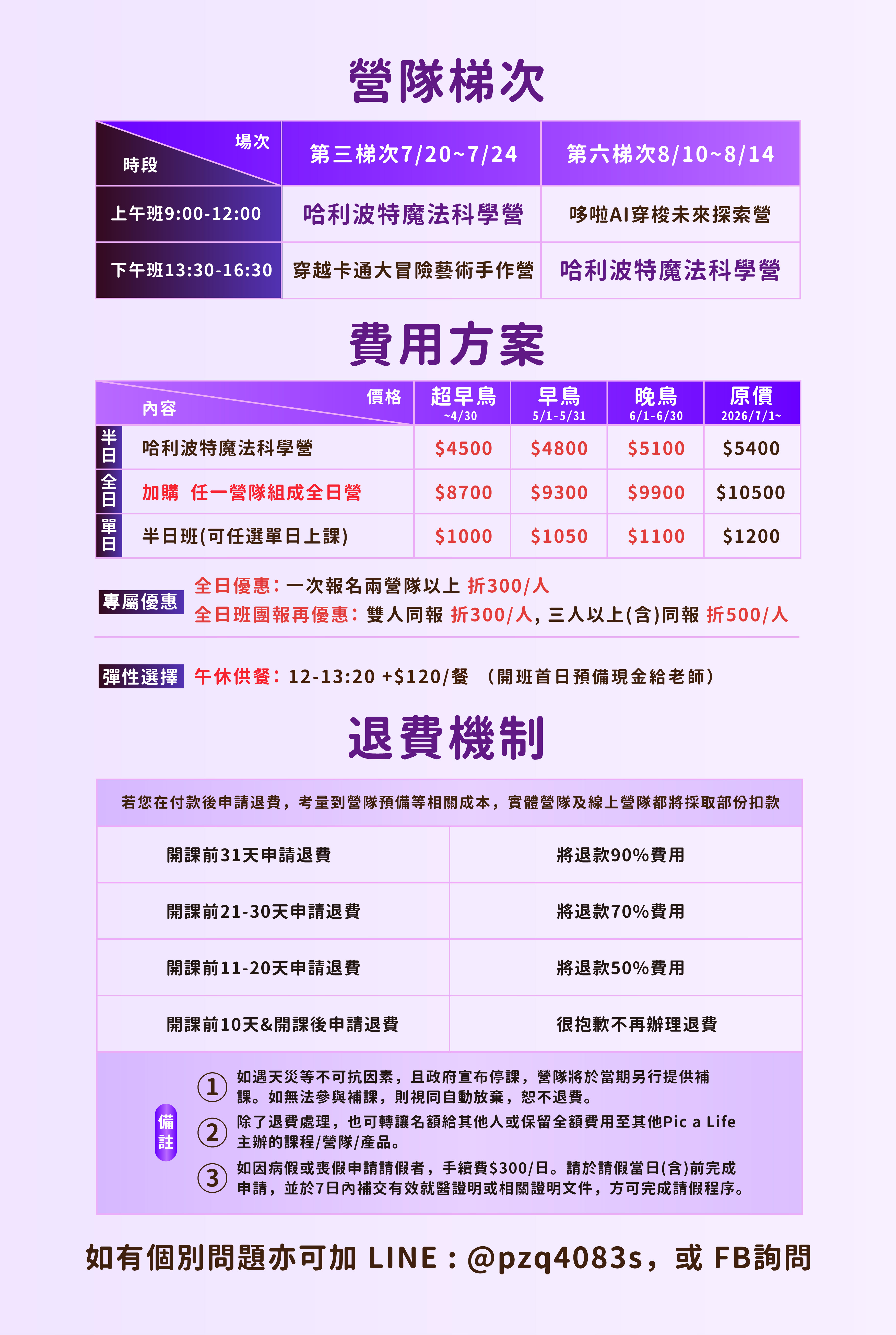 ➍ 由於營隊有最低開班人數6位,我們將於 12 月 20 日 左右 公布最終開班梯次與營隊,並自 12 月初與報名人數較少的營隊家長聯繫,協助調整校區、營隊或梯次。若報名營隊未開班,可透過 LINE 客服調整至其他梯次/營隊/校區,或選擇全額退款。